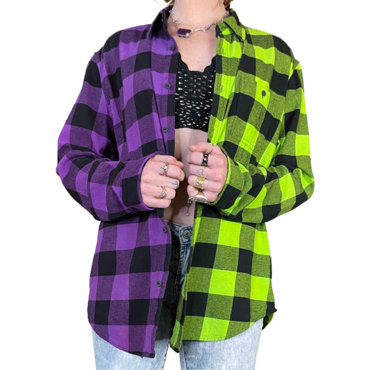 Women's Purple and Neon Green Flannel - Custom Tie Dye Color Split Buffalo Plaid Shirt