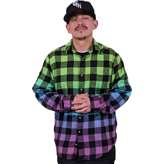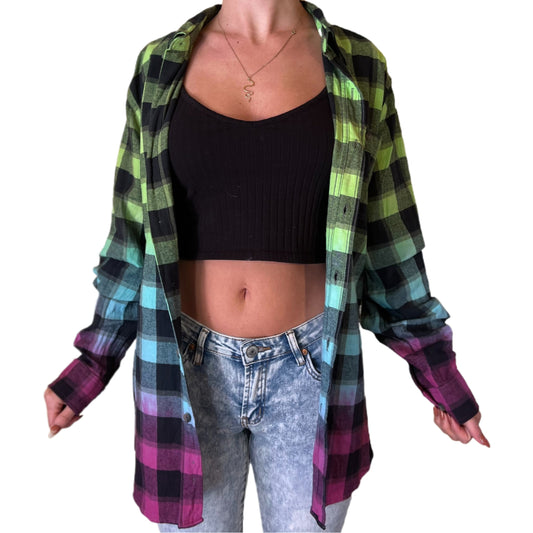 Oversized Tie Dye Flannel - Custom Green Blue Purple Color Fuse Buffalo Plaid Shirt