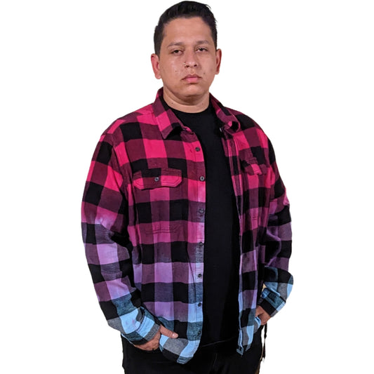 Men's Hot Pink Purple Blue Flannel - Custom Tie Dye Color Fuse Buffalo Plaid Shirt