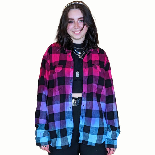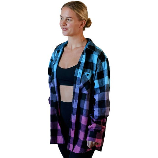 Oversized Blue Purple Hot Pink Flannel - Women's Gradient Color Fuse Buffalo Plaid Shirt