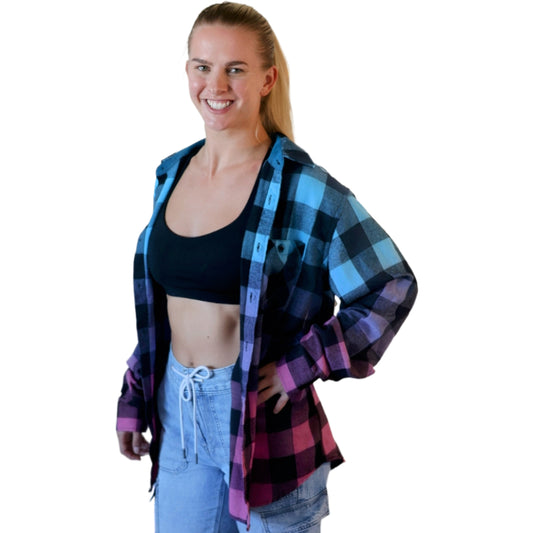 Women's Tie Dye Flannel - Oversized Hot Pink Purple Blue Color Fuse Buffalo Plaid Shirt