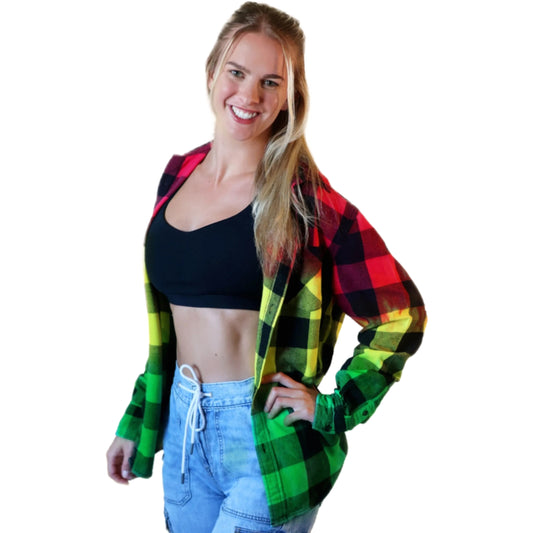 Rasta Tie Dye Flannel - Women's Red Yellow Green Oversized Reggae Buffalo Plaid Shirt