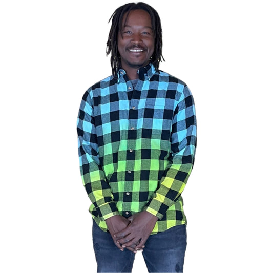 Oversized Tie Dye Cali Flannel - Custom Neon Blue Green Yellow Color Fuse Buffalo Plaid Shirt