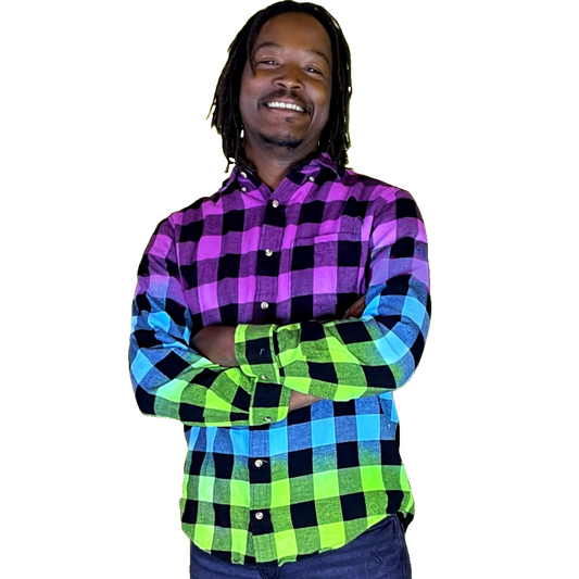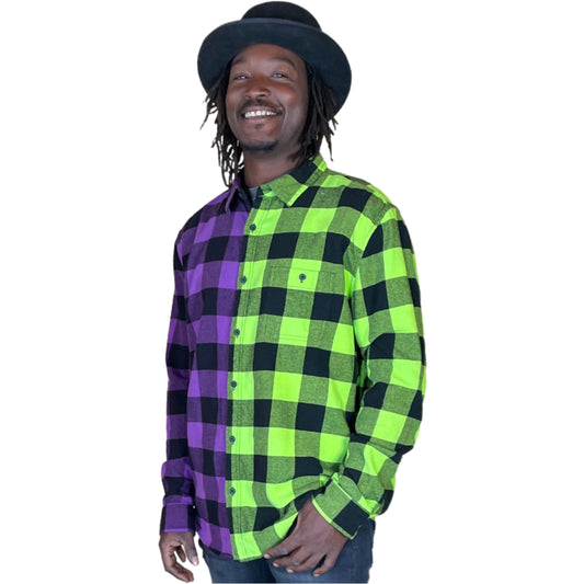 Men's Purple and Neon Green Flannel - Custom Tie Dye Color Split Buffalo Plaid Shirt