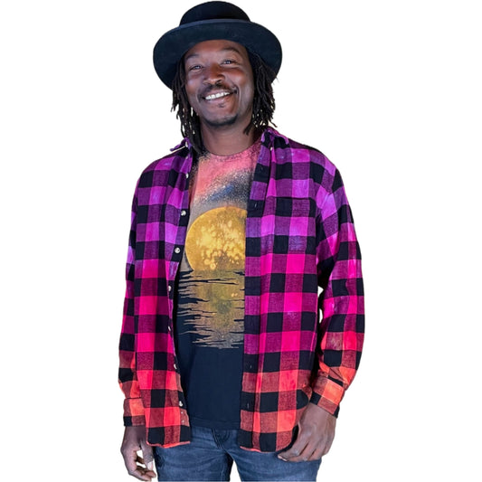 Men's Purple Pink Orange Flannel - Custom Tie Dye Color Fuse Buffalo Plaid Shirt
