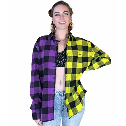 Purple and Neon Yellow Flannel - Women's Tie Dye Color Split Buffalo Plaid Shirt