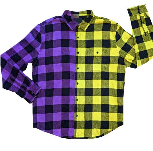 Men's Purple and Neon Yellow Flannel - Custom Tie Dye Color Split Buffalo Plaid Shirt